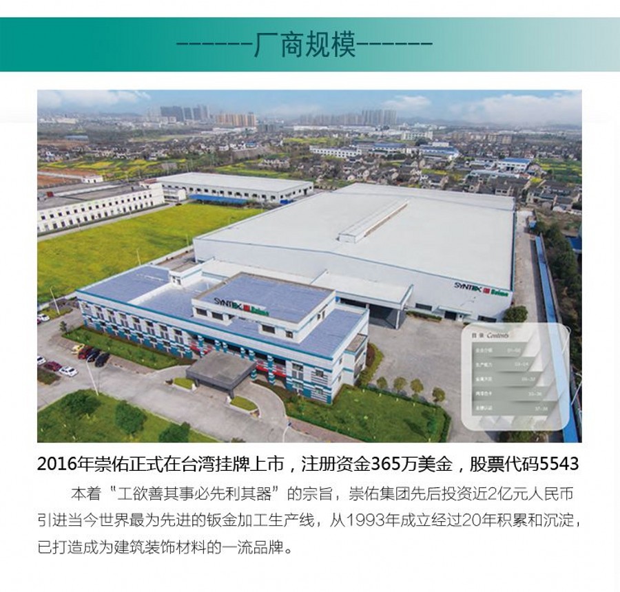介紹:鋁天花、方板天花、微孔天花、鋼板天花、工程天花,嵌入式暗架系統(tǒng)和放置式明架系統(tǒng),易拆卸,防塵隔音,崇佑品牌,行業(yè)知名品牌。