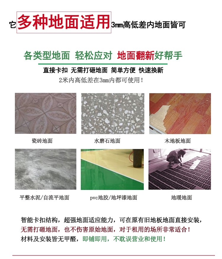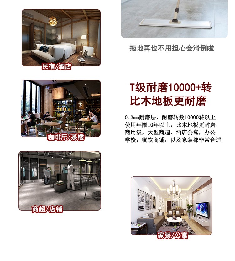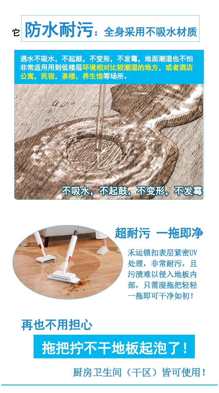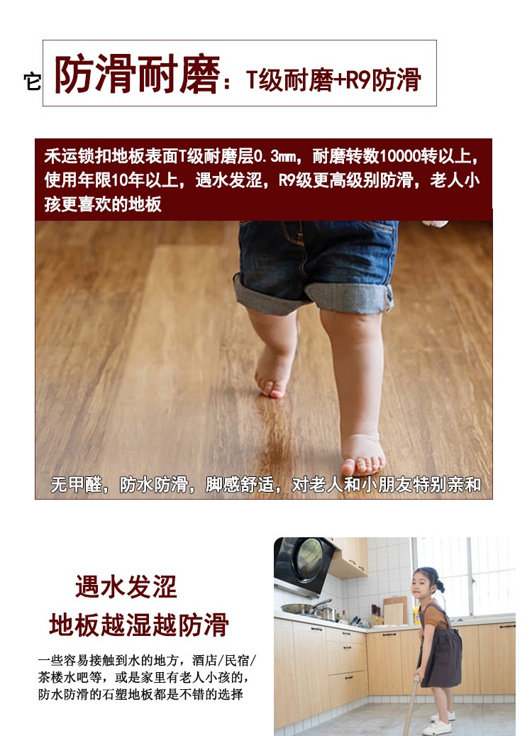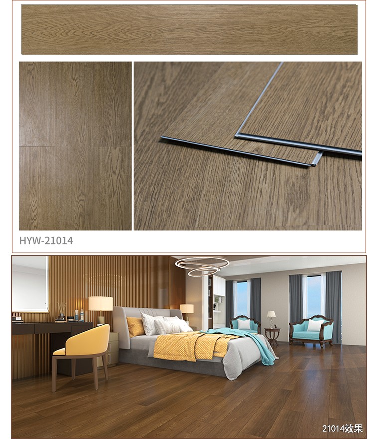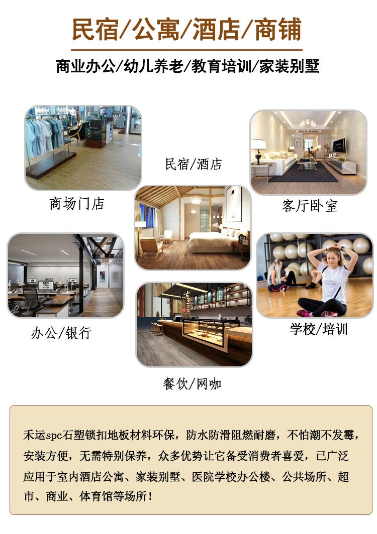介紹:spc鎖扣石塑地板,是由鈣粉、聚氯乙烯穩(wěn)定劑組合的一定比例混合形成復(fù)合地鋪材料。是現(xiàn)在非常流行的一種無醛環(huán)保地板,極為穩(wěn)定、高性能、完全防水、高密度銷售芯、耐壓痕;它可以很容易地安裝在不同類型的地面基地,混凝土,陶瓷或現(xiàn)有的地板,非常適合用于舊地面改造,老舊瓷磚木地板地毯等地面翻新使用。安裝快速簡(jiǎn)單,材料環(huán)保無味,即鋪即用。是響應(yīng)國家減排而發(fā)明的新型材料,是100%不含甲醛的環(huán)保地板,是真正的0甲醛地板。因其厚度薄、花色多、款式全、低碳環(huán)保的性能可廣泛應(yīng)用于幼兒園、醫(yī)院、辦公室、寫字樓、商場(chǎng)、家居、酒店、公寓、別墅、KTV等公眾場(chǎng)所。